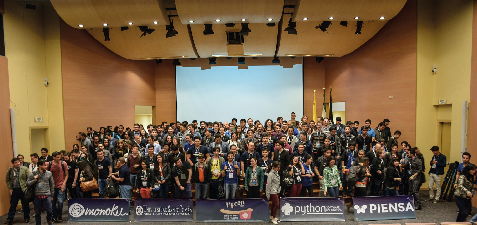 La conferencia tuvo lugar en las modernas instalaciones de la Universidad Santo Tomás, gracias al compromiso del grupo docente de la Facultad de Estadística y el apoyo de las directivas de la universidad, tanto en las actividades de la conferencia como el la logística del evento. Además contamos con el importante apoyo de los sponsor Python Software Foundation, Monoku y Piensa Labs, quienes también apoyaron con su equipo humano al contenido de conocimiento de la conferencia, presentando temas en el campo del internet de las cosas, Análisis semántico y procesamiento de imágenes, entre otros.