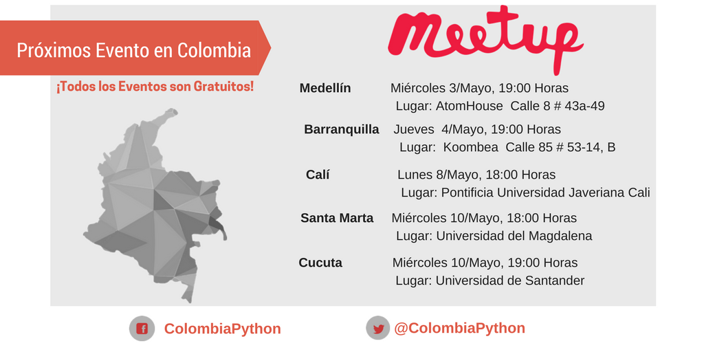 10 de Mayo — Primera Meetup Python Cúcuta: Introducción a la programación con Python es la primera charla, continuando con la charla Python Colombia y Pycon Colombia: unificando industria y academia.
