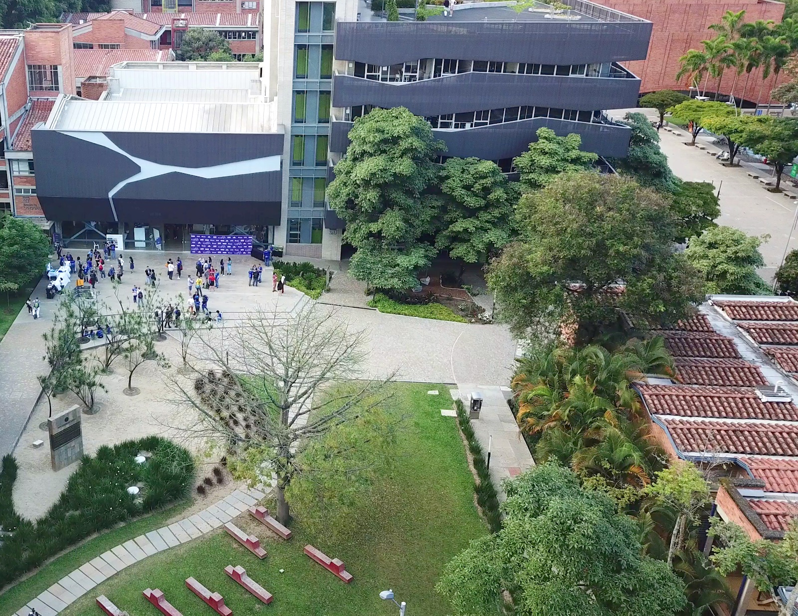 EAFIT University, Medellín — Building 28: Fundadores Auditorium (left), Building 29: Financial and administrative department, Department of Continuing education, Alumni Center, Student Groups, Classrooms (right)