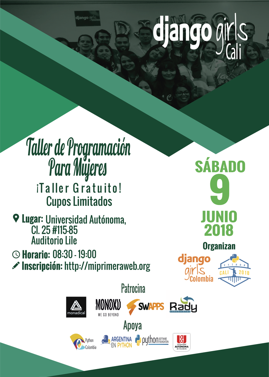 ¡Ayudanos con la difusión compartiendo esta página y comentando sobre el taller las redes sociales, tu universidad y entre tus amigos! Este evento forma parte de Django Girls y tiene su propio sitio web bajo esta marca: Django Girls Cali