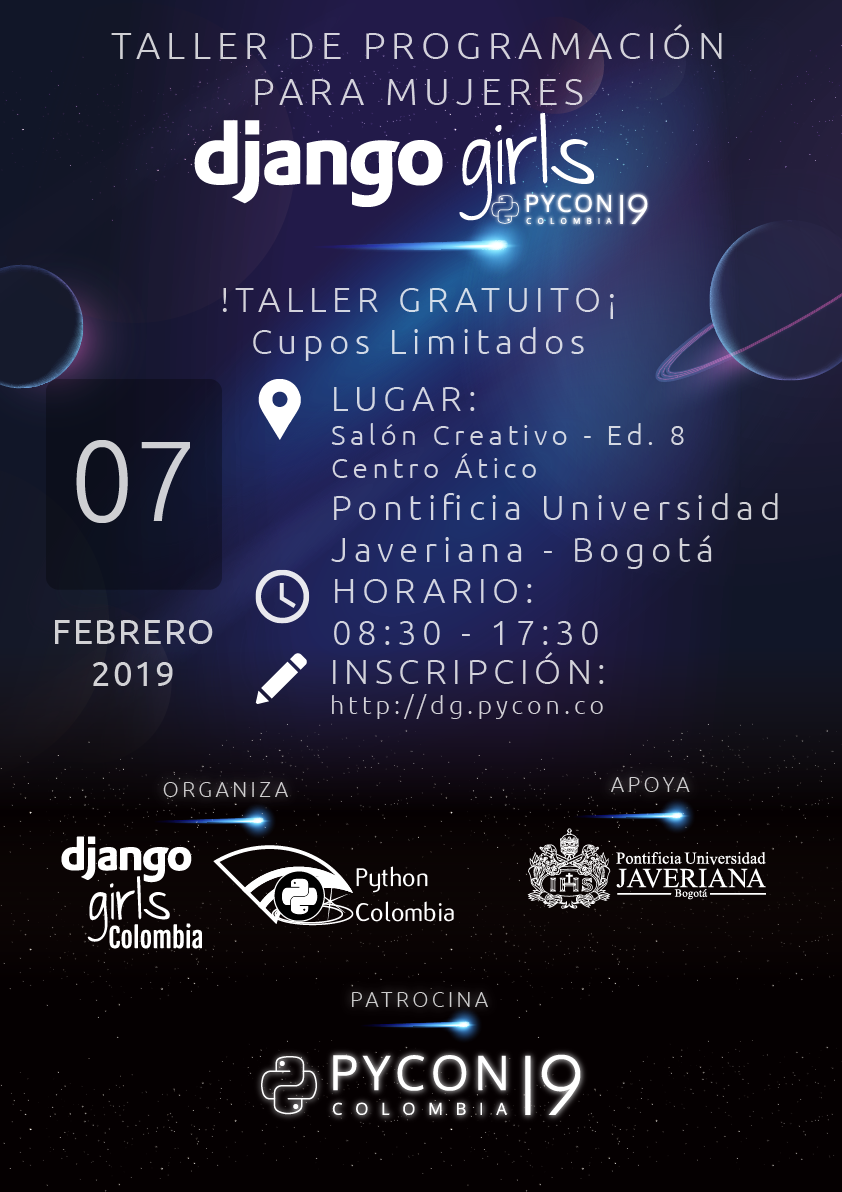 Este taller de Django Girls se realiza en el marco de la Conferencia de PyCon Colombia organizado por la comunidad de Python Colombia. Es el evento de programación en Python más grande del país.
